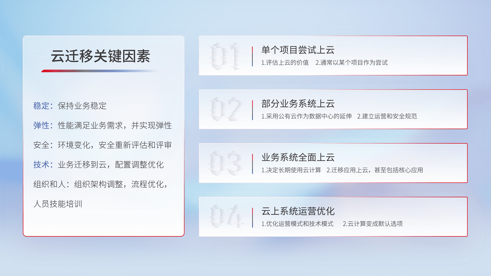 结合实际业务,,,,从规划设计、、、云平台选型、、云原生改造、、数据迁移、、集成交付,,,,迁移全过程为客户识别最佳上云路径,,,,做好风险识别管理,,,,设计网络架构、、、身份权限、、、安全审计合规、、、操作审计、、、日志审计、、监控告警策略、、、多站点容灾设计等,,对云上基础设施进行整体规划,,提升IT治理水平,,,,以满足弹性、、高可用、、高性能的需求。。