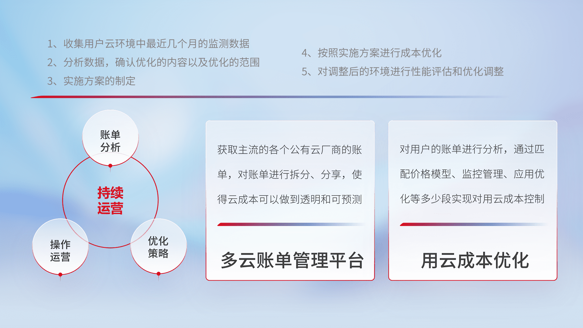 通过多云纳管,,,以统一的资源数据模型把客户的云资源进行抽象和封装,,,,进而实现对多云资源的统一操作,,保障云资源管理的可靠性、、、、稳定性与可用性。。量身定制化运维内容,,,配置、、、开发运维、、、补丁管理、、、备份、、、监控、、、认证和访问管理、、、、审计和日常巡检等,,,保障在用云过程中的可靠度,,,稳定度以及高可用率。。。